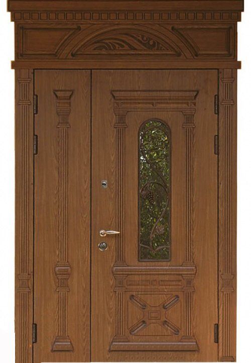 Поскольку в большинстве случаев устанавливаемые на входе в коттедж двустворчатые двери являются еще и предметом интерьера, украшающим здание, их дизайну предается особое значение. Эти двери, как правило, отделываются атмосферостойким МДФ, натуральным шпоном, массивом. Эффектно на таких дверях смотрится витражный узор, применение ковки, зеркальных элементов. Вариантов декора входной двустворчатой двери масса, тут все зависит от пожеланий заказчика.