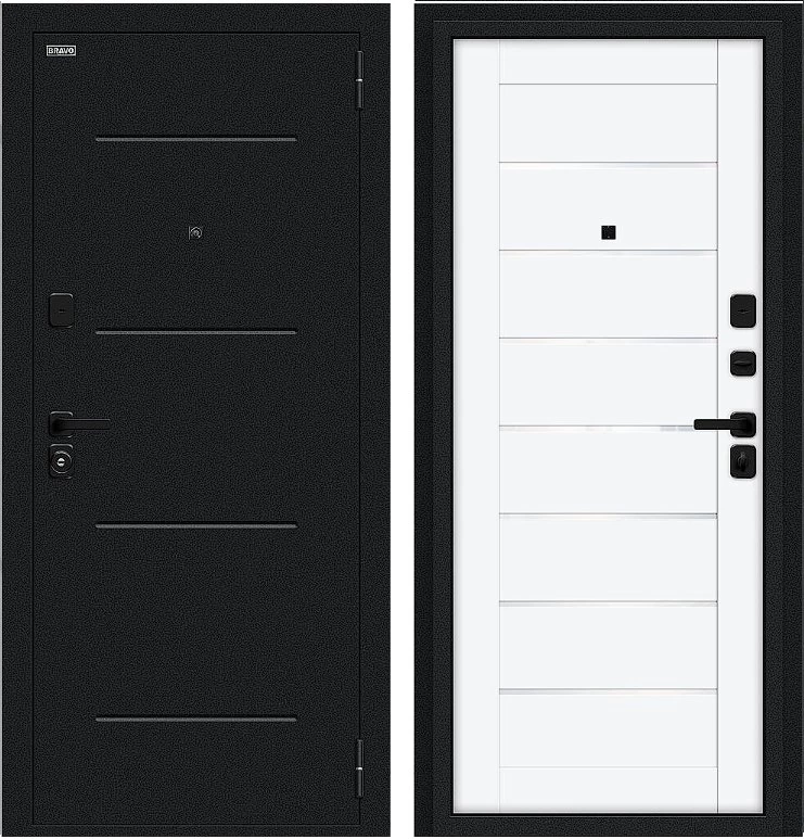 Надежная входная Дверь Браво Техно/SBlack Букле черное/White Silk премиум класса по цене 34 803 руб. Большая толщина стали защитит от проникновения в ваш дом, квартиру или коттедж. Используется очень качественная фурнитура: замки, цилиндры, ручки, защелки. Покрытие и отделка двери изготовлено под внимательным контролем производителя. Дверь имеет долгий срок службы и гарантию.